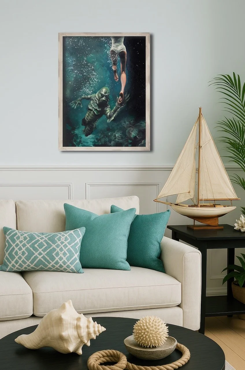 Two Worlds Apart is the story of an impossible love born in silence and destined to end at the surface. This print captures an underwater moment between a woman and a creature, rendered with fluid brushwork and a moody palette. It invites you to reflect on the tragedy and tenderness of a connection that cannot last above water.